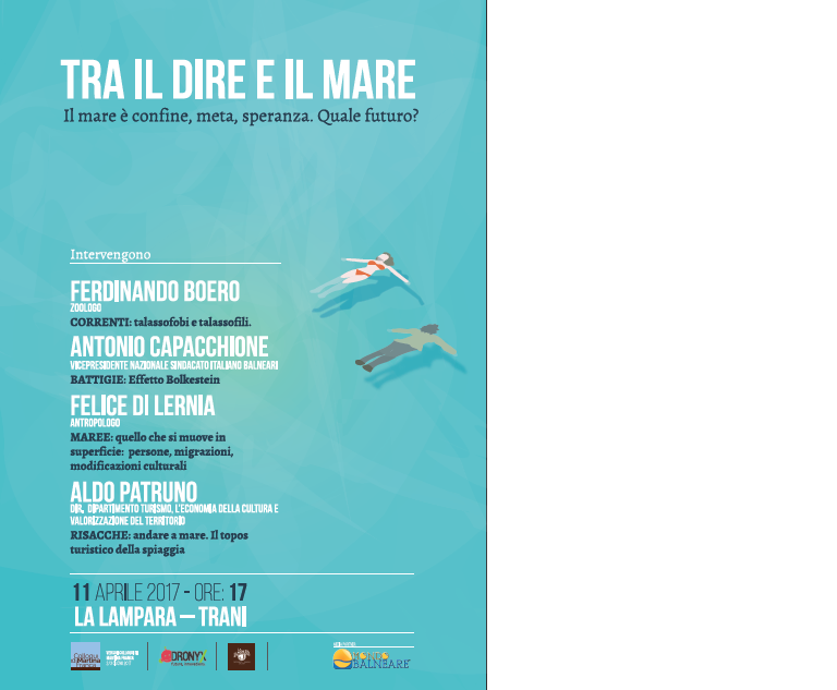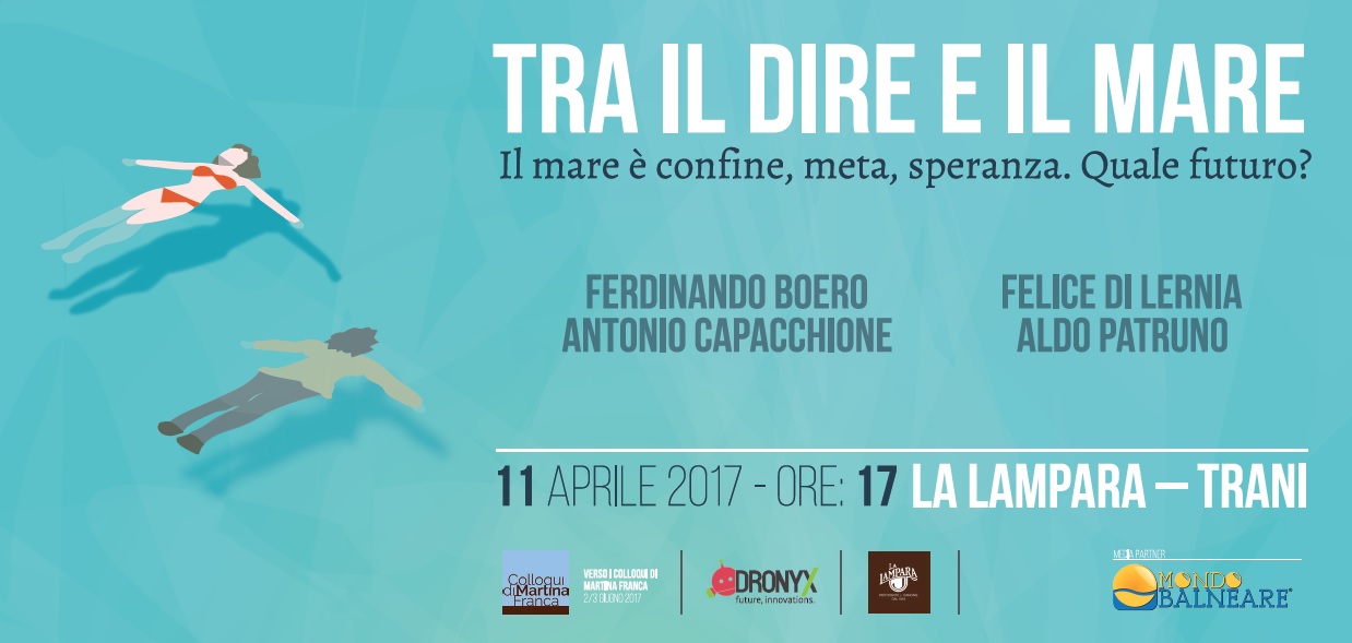Tra il dire e il mare è un evento organizzato da Costellazione Apulia, nell’ambito dei Colloqui di Martina Franca, un’iniziativa che da quattro anni intende portare alla riflessione sui modelli di sviluppo e di impresa. L’evento di Trani è sostenuto da La Lampara, tra i più antichi ristoranti di Trani, voluta dall’allora Amministrazione Comunale nel 1954 per attirare turismo di qualità, e da Dronyx, azienda che produce soluzioni sostenibili per la pulizia delle spiagge. Tradizione e innovazione.